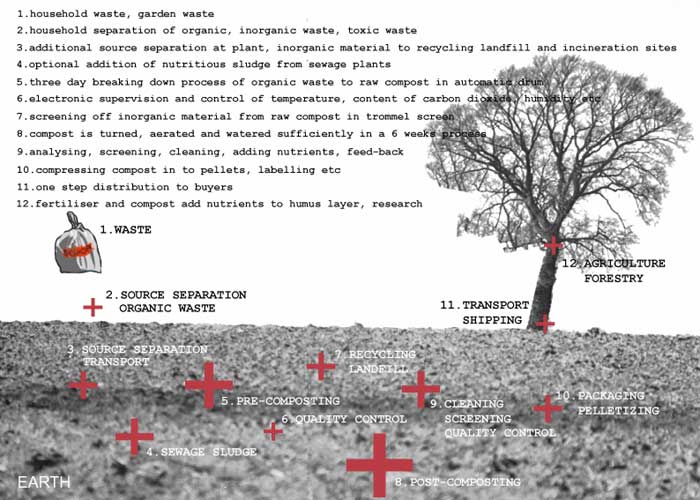 back | The prototype uses the "Rondeco" composting method for breaking down organic matter. The process is particularly time efficient and the end product is fertiliser compressed into pellets to be used for agriculture and forestry. The different stages of the composting process require different amount of space, on or off site. Specific components of the process can interweave with other flows and programmes of the prototype in the time phasing of the project. |